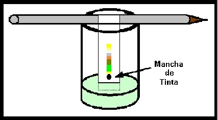 Recorta una tira del papel poroso que tenga unos 4 cm de ancho y que sea un pocomas larga que la altura del vaso. Enrolla un extremo en un bolígrafo (puedesayudarte de cinta adhesiva) de tal manera que el otro extremo llegue al fondo delvaso. (Ver dibujo). Dibuja una mancha con un rotulador negro en el extremo librede la tira, a unos 2 cm del borde. Procura que sea intensa y que no ocupe mucho.(Ver dibujo). Echa en el fondo del vaso alcohol, hasta una altura de 1 cm aproximadamente.Sitúa la tira dentro del vaso de tal manera que el extremo quede sumergido en elalcohol pero la mancha que has hecho sobre ella quede fuera de él. Puedes tapar elvaso para evitar que el alcohol se evapore. Observa lo que ocurre: a medida que elalcohol va ascendiendo a lo largo de la tira, arrastra consigo los diversos pigmentosque contiene la mancha de tinta. Como no todos son arrastrados con la mismavelocidad, al cabo de un rato se ven franjas de colores. Repite la experienciautilizando diferentes tintas.