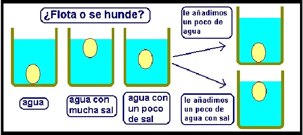 Llena dos vasos con agua. Añádele a uno de ellos sal poco a poco. Revolviendo conuna cuchara, trata de disolver la mayor cantidad posible. En un vaso de 200 cm3 sepueden disolver unos 70 g de sal. Coloca el huevo en el vaso que tiene solo agua : seirá al fondo. Colócalo ahora en el vaso en el que has disuelto la sal : observaráscomo queda flotando.Pon el huevo y agua hasta que lo cubra y un poco más, en el tercer vaso. Añade aguacon sal, de la que ya tienes, hasta que consigas que el huevo quede entre dos aguas(ni flota ni se hunde). Si añades en este momento un poco de agua, observarás quese hunde. Si a continuación añades un poco del agua salada, lo verás flotar denuevo. Si vuelves añadir agua, otra vez se hundirá y así sucesivamente.