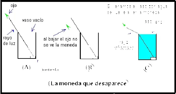 Se coloca la moneda en el fondo del vaso vacío tal como se indica en la figura A. Laluz que sale de la moneda se transmite en línea recta e incide en el ojo. Al bajar unpoco la posición del ojo, la moneda desaparece (figura B). Al llenar el vaso con agua,la moneda aparece de nuevo (figura C).