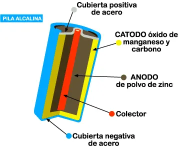 •Baterías alcalinas. Los electrodos son de cinc y óxido de manganeso con un electrolito alcalino.