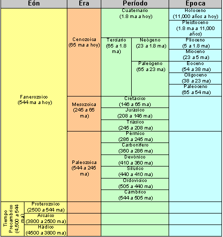 Tomando como base cronológica el millón de años (ma), las DIVISIONES GEOCRONOLÓGICAS en que se divide la historia terrestre reciben el nombre de