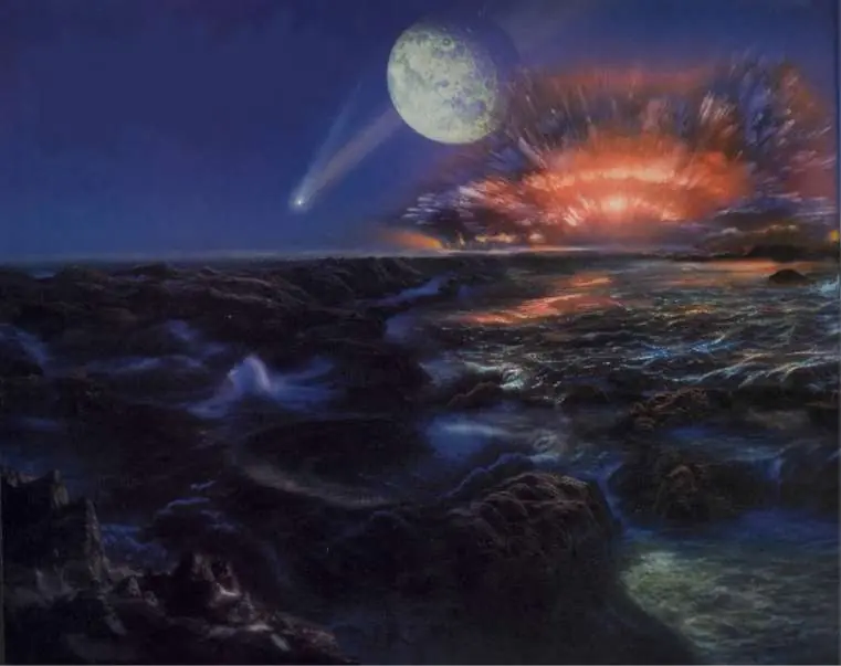 La atmósfera terrestre es completamente reductora, es decir, carece de oxígeno gas y está formada por gases como el hidrógeno, el metano, amoníaco, CO2, etc. La superficie terrestre recibe continuos impactos de meteoritos que retrasan el enfriamiento de su superficie, situación que se prolonga hasta hace unos 3900 ma.