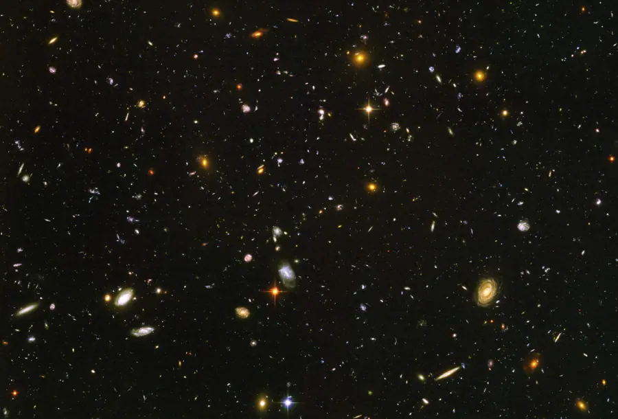 El Hubble ve tan lejos, tan lejos, que cuando mira a las profundidades del espacio puede tomar imágenes como esta que contiene luz de estrellas y galaxias situadas a 13.000 millones de años luz de distancia. Eso quiere decir que lo estamos viendo tal y como era hace 13.000 millones de años (se calcula que nuestro universo tiene unos 13.700 millones de años). La imagen se conoce como Campo Ultra Profundo del Hubble: requirió un montaje de diversas tomas hechas día a día durante más de un año y se considera una de las fotos más impactantes de nuestro universo.