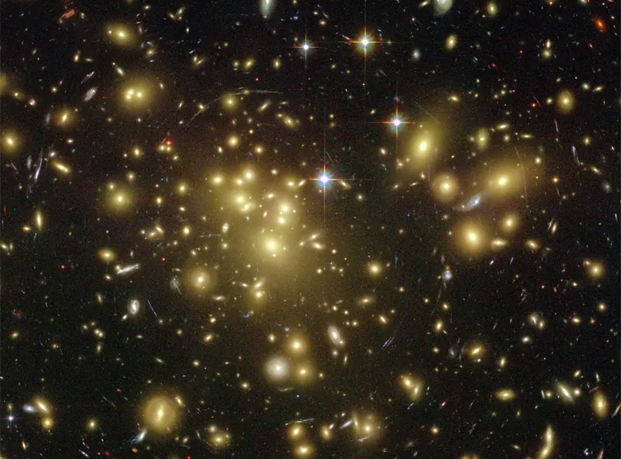 En algunos lugares del universo, la gravedad generada por la materia oscura es tan intensa que incluso la luz visible se curva a su paso, como predijo Einstein y se aprecia en esta imagen: los «arcos» son en realidad una misma estructura, un cúmulo de galaxias llamado Abell 1689, que está situado más o menos en el centro, al fondo de la foto