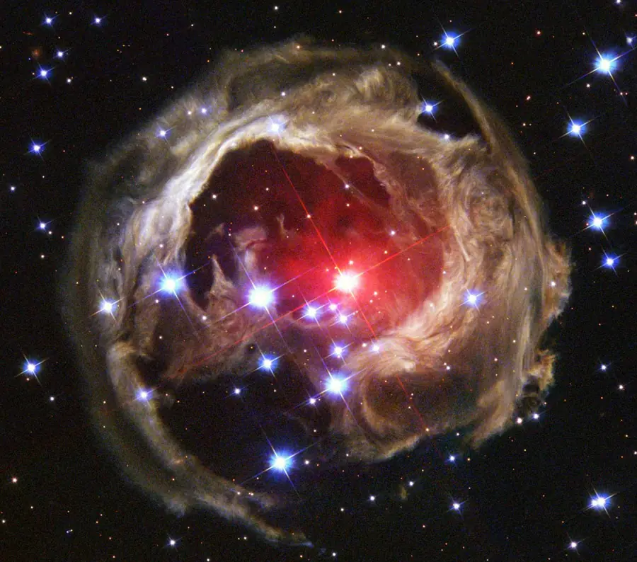 Esta es otra de las fotos consideradas más bellas de entre todas las tomadas por el Hubble, simplemente por lo espectacular de su aspecto y colorido. Se corresponde con V838 Monocerotis, una estrella variable situada a 20.000 años luz del Sol