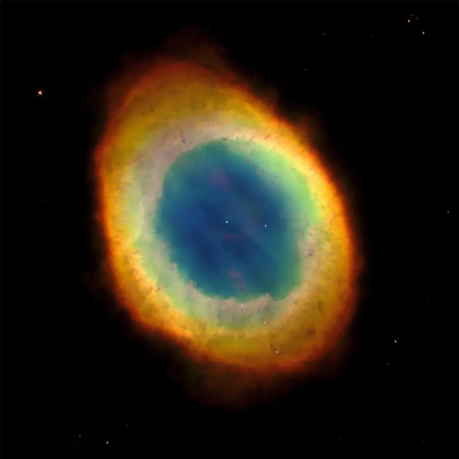 Al igual que en muchas de las fotos del Hubble, los colores visibles de las imágenes son composiciones de los astrónomos para indicar las diversas estructuras de los objetos estelares. En este caso colorearon la Nebulosa del Anillo para mostrar la temperatura de los gases que la rodean, de más caliente (azul y verde) a más frío (amarillo y rojo) en el exterior