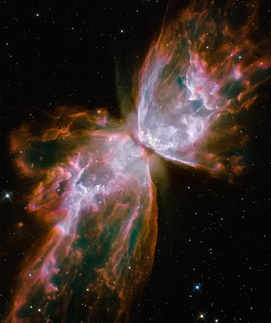Esta impresionante imagen de la nebulosa NGC 6302, con forma de mariposa fue tomada con una de las nuevas cámara del Hubble en 2009 y es una buena demostración de la nitidez y calidad que puede obtenerse hoy en día tras las diversas reparaciones y mejoras llevadas a cabo en el telescopio