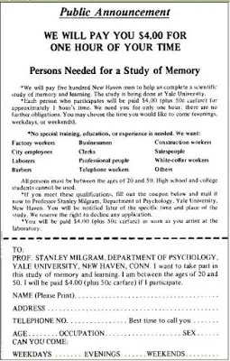 Milgram puso entonces en marcha un experimento pionero sobre la obediencia humana. A través de anuncios en un periódico de Connecticut contrató varios voluntarios para participar en lo que se publicitaba como un estudio "Sobre el aprendizaje y la memoria en la Universidad de Yale", a quienes se les pagaría US$ 4 por el par de horas que duraría el experimento. Algo así como unos US$ 28 actuales.