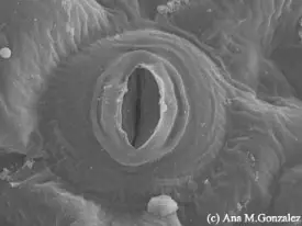 Son pares de células especializadas en el intercambio gaseoso con el medio ambiente, a la vez que se encargan de regular la transpiración. Cada estoma está constituido por un par de células de forma arriñonada llamadas células oclusivas; poseen núcleo y orgánulos celulares como cloroplastos. Entre las dos células oclusivas hay un pequeño orificio llamado ostíolo. El estoma puede estar rodeado de células anexas, cuya cantidad y disposición determina el tipo de aparato estomático: anomocítico, paracítico, diacítico, anisocítico, tetracítico, etc. En las Gramíneas y Ciperáceas las células oclusivas son halteriformes (forma de pesas de gimnasta) con dos células anexas laterales.