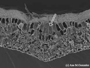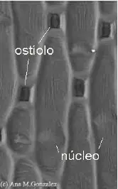 Note las células ordenadas en fila, la fosa de los estomas y la protrusión del núcleo