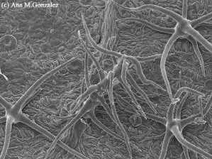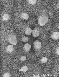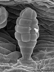 Epidermis de trepadora Serjania comunis, note el pelo glandular y los estomas, MEB 600x.