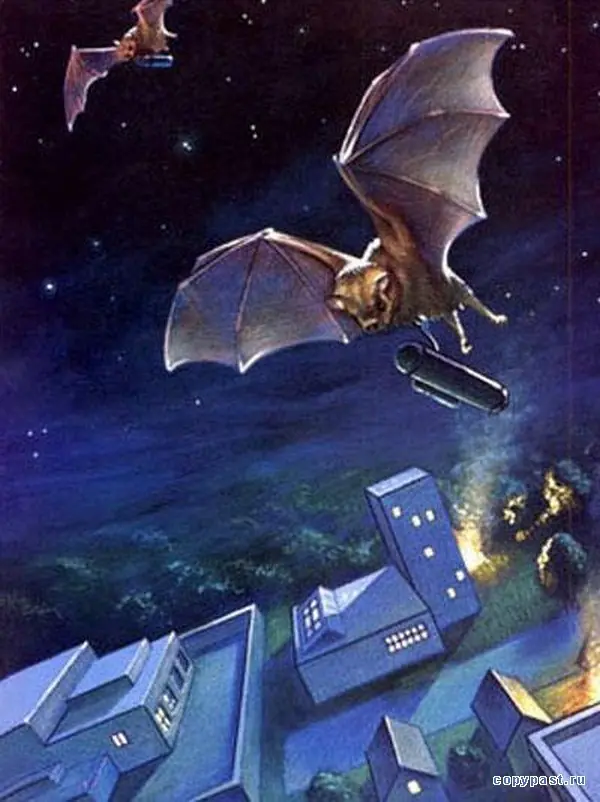 ► Durante la Segunda Guerra Mundial, el ejército de Estados Unidos estaba desarrollando un proyecto llamado “X-ray” (Rayo X). Los murciélagos eran entrenados para llevar bombas a las grietas de los edificios y a los árboles de ciudades japonesas para generar incendios destructivos. Los murciélagos molósidos [familia Molossidae] fueron seleccionados ya que pueden volar bien con una bomba de una onza [28,3 gramos]. Por problemas en las pruebas el proyecto fue cancelado [he leído que incluso que “los murciélagos bomba le prendieron fuego a las propias instalaciones de la base militar”…]