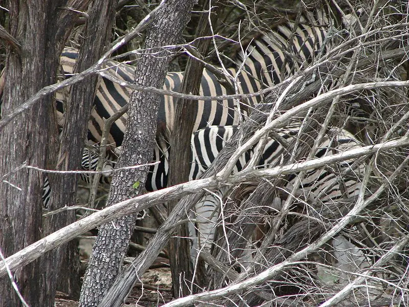Algunos zoólogos creen que las rayas son un mecanismo de camuflaje. Este mecanismo funciona de varias maneras. Para empezar, las rayas verticales contribuyen a esconder la cebra entre las hierbas. A pesar de que esto puede parecer absurdo a primera vista, teniendo en cuenta que la hierba no es ni blanca ni negra, se supone que es efectivo contra el predador principal de las cebras, los leones, que son daltónicos. En teoría, una cebra que permanezca quieta entre hierbas altas podría pasar desaparcibida para un león. Además, como las cebras son animales gregarios, las rayas ayudan a confundir a los predadores – varias cebras que estén o que se muevan juntas pueden parecer un único y gran animal, haciendo que el león tenga problemas para elegir una sola cebra para atacar. Un rebaño de cebras que se dispersen para huir de un predador le parecerán una masa confusa de rayas verticales moviéndose en direcciones diferentes, haciendo que al predador le cueste seguir visualmente a un individuo que se separe de sus compañeros. Aún así, los biólogos no han observado nunca leones que parezcan confundidos por las rayas de las cebras.