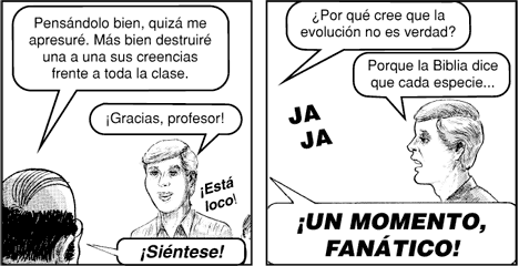 un profesor de universidad, con un título va a dejar de creer en la evolución porque un chico religioso, con argumentos de cuarta, la refutó?