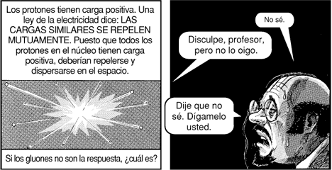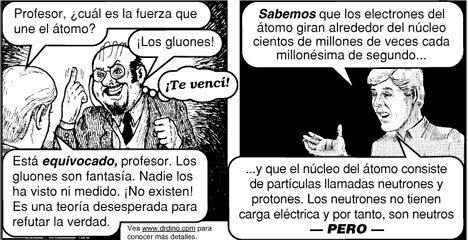 El chico niega los gluones (bosón portador de la interacción nuclear fuerte, una de las cuatro fuerzas fundamentales.) existen porque nadie los ha visto ni medido pero aquí esta el problema: