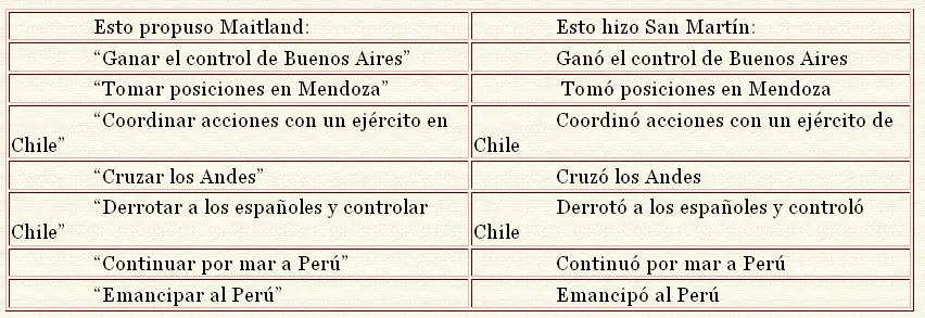 El cuadro de la página siguiente grafica lo que ya hemos visto: San Martín siguió, paso a paso, el derrotero propuesto por Maitland.