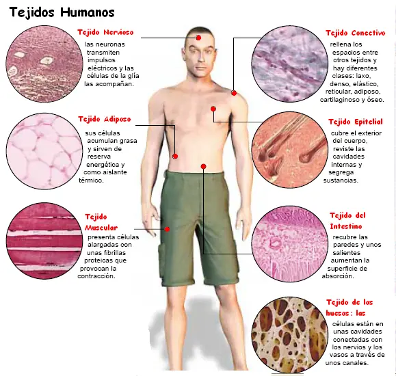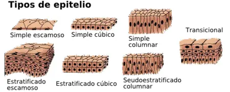 _ Tejido epitelial: El epitelio es el tejido formado por una o varias capas de células unidas entre sí que puestas recubren todas las superficies libres del organismo, y constituyen el revestimiento interno de las cavidades, órganos, huecos, conductos del cuerpo y la piel y que también forman las mucosas y las glándulas. Los epitelios también forman el parénquima de muchos órganos, como el hígado.