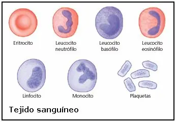 _ Tejido sanguíneo (sangre): La sangre (humor circulatorio) es un tejido fluido que circula por capilares, venas y arterias de todos los vertebrados e invertebrados. Su color rojo característico es debido a la presencia del pigmento hemoglobínico contenido en los eritrocitos.