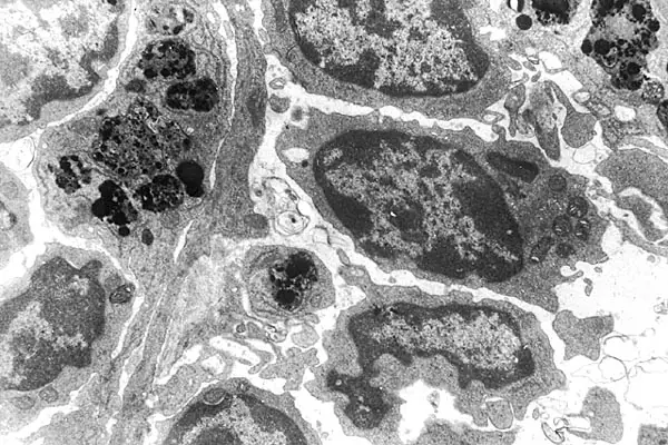 _ Tejido hematopoyético: El tejido hematopoyético es el responsable de la producción de células sanguíneas. Existe tejido hematopoyético en el bazo, en los ganglios linfáticos, en el timo y, fundamentalmente, en la médula ósea roja, el centro hematopoyético más importante del organismo. En el momento de nacer, toda la médula ósea es roja. En los individuos adultos, la médula roja persiste en los intersticios de los huesos esponjosos. Se trata de un tejido blando, formado por fibras reticulares y una gran cantidad de células: adiposas, macrófagos, reticulares y precursoras de las células sanguíneas.