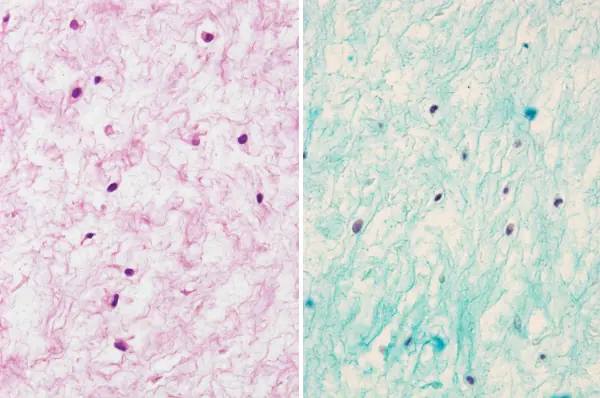 _ Tejido conectivo mucoso o gelatinoso: Es un tejido conectivo laxo en el que predomina la sustancia fundamental amorfa compuesta por ácido hialurónico. La celularidad es media, principalmente fibroblastos y macrófagos, irregularmente dispersos en la matriz jaleosa.