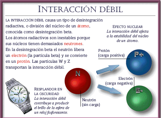 Los protones están formados por quark, que tienen diferentes cargas eléctricas. Es necesario mantener el equilibrio de las cargas eléctricas de los quarks, para que el resultado sea un protón de carga positiva. La fuerza nuclear débil es la que une los quarks dentro del potrón. Y la fuerza núclear débil dentro del neutrón (sin carga eléctrica) es más complicada todavía, porque consigue un equilibrio que permita el resultado de una carga eléctrica anulada. En el apartado siguiente veremos que las particulas que transporta la energía electromagnética son los fotones, que se desplazan a largas distancias. Sin embargo, las partículas que transportan la fuerza nuclear débil son los bosones W y Z. Tienen masa superior a la del potrón, y por lo tanto, las distancias de transporte son cortas. Es decir. Tenemos unas partículas que son los protones, que dentro tienen quarks. La relación entre quarks produce fuerza nuclear débil, que es transportada por bosones, que tienen una masa superior a la del bosón. Los científicos no se explican por qué el boson tiene tanta masa, porque lo lógico es que tuviera menos que la de un potrón.