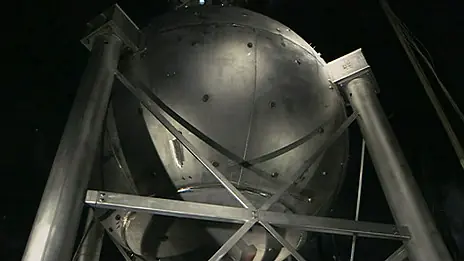 Dentro de un tanque del tamaño de una casa, una enorme esfera metálica contiene un detector de partículas llamado centelleador.