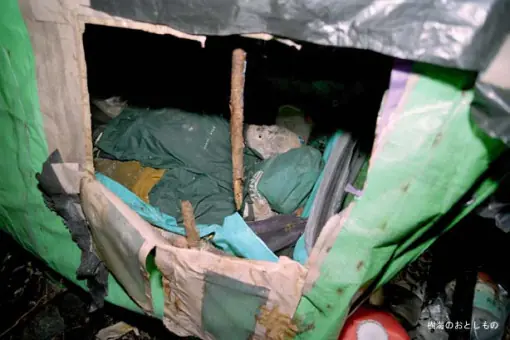 Mientras continúa la discusión aparece ante nosotros, entre los arbustos, algo que parece una tienda de campaña o una especie de chabola montada con plásticos y cartones. Nos acercamos para ver que es, quizás en el sumun de lo macabro a alguien se le ha ocurrido pasar unos días de acampada en este lugar tan terrorífico. Cuando meto la cabeza en el interior lo que me encuentro es todavía peor que los huesos esparcidos que nos habíamos topado hasta el momento… un cuerpo medio momificado descansa en el interior entre ropas sucias y pestilentes. Tras una vomitona antológica salgo de nuevo a la carrera y el resto del grupo hace lo mismo, incluso algunos no tienen reparos en adelantarme a los pocos segundos.