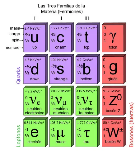 Hasta ahora hemos hablado de algunas partículas: los quarks, el electrón, el gluón, los bosones W y Z, y el fotón. A continuación vamos a hacer una distinción más y a separar las partículas en dos grandes grupos. El primero es el de las partículas que dan lugar a la materia, y el segundo será el de las partículas propagadoras de interacciones (fuerzas).