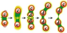 La interacción fuerte también es la responsable de unir los protones dentro del átomo, y tiene un alcance muy limitado. No funciona a escalas mayores que el propio núcleo atómico, es decir del orden de 10-15 metros, unidad que se conoce como femtómetro o fermi. La partícula pegamento que une los protones o los quarks recibe el nombre de gluón y también tiene carga, aunque en este caso no es eléctrica sino que se llama carga de color. Este color puede ser rojo, verde o azul. Y como casi todo en la naturaleza tiene su antagonista, en este caso tenemos los anticolores: antirojo, antiverde y antiazul. Para aclarar posibles confusiones, no debéis imaginaros la carga de color como si los quarks tuvieran realmente un color que podamos ver. Esto sería imposible. Debemos verla simplemente como una propiedad física más de las partículas, como puede ser su carga eléctrica o su masa.