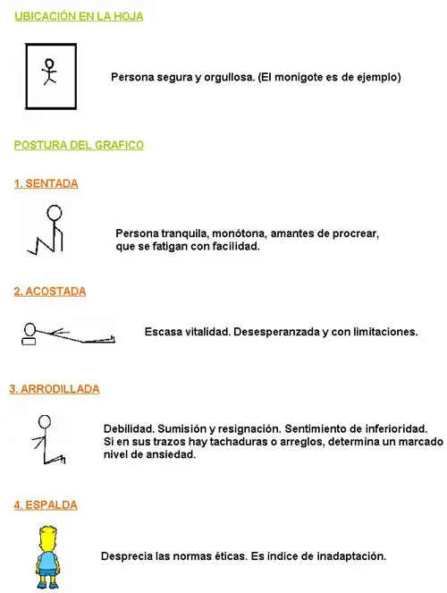 DE ESPALDAS: deseos de no ser controlado socialmente, de pasar inadvertido. Afectos e intenciones ocultas , se aparten del medio ( presicóticos, depresivos, psicopatías). Problemas con la identificación sexual. Deseos de ser otro. Ocultamiento.