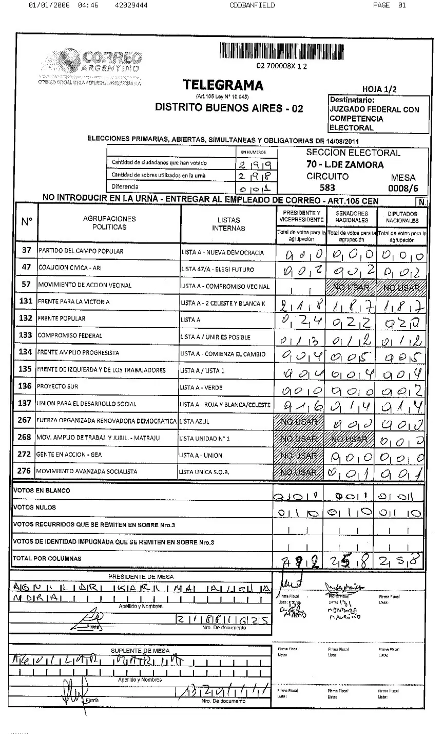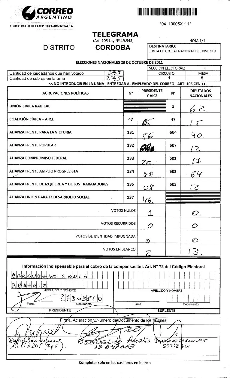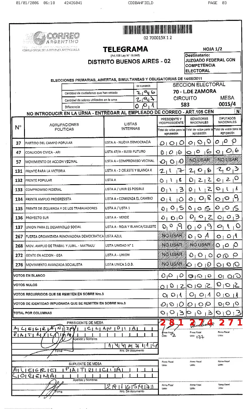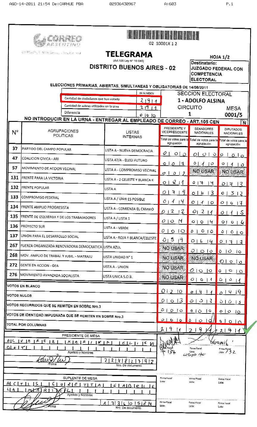 Como puede verse ven aquí, el resultado de la suma de cada una de las columnas (presidente, vice, senadores y diputados) es igual entre sí e igual respecto a la cantidad de ciudadanos que han votado en esa mesa.