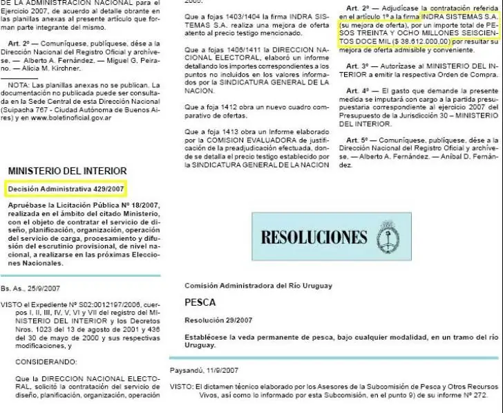 La otra entidad que cuestionó a la misma empresa fue la Oficina Anticorrupción: lo hizo en 2005 ante la presunción de que los pliegos estaban hechos a medida de Indra, al tiempo que denunció al ministerio del Interior —a cargo en esos días de Aníbal Fernández— por el pago de sobreprecios por 5 millones de pesos.