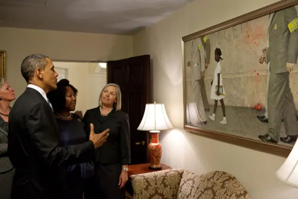 Han pasado cuarenta y ocho años desde que Norman Rockwell la inmortalizó en un lienzo. Una vez más el artista plasmó con su acostumbrada carga de realidad lo que acontecía en la sociedad norteamericana de la época. Quién iba a decir que la niña de trencitas y vestido blanco que figura en la obra de Rockewell, El problema con el que todos convivimos, volvería a su escuela, al lugar en el que vivió una experiencia que quedaría marcada en su vida y en la historia de su país.