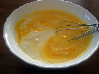 Con un batidor eléctrico, montamos las claras a punto de nieve, reservamos.Y a continuación agregamos las yemas a la mezcla de quesos.
