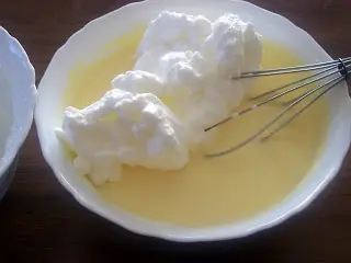 Añadimos las claras montadas a la mezcla de los quesos con batidor removiendo despacio