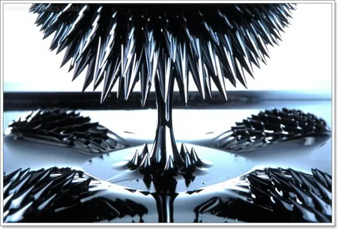 Los ferrofluidos, en cambio, son metales líquidos y fríos (¿te suena T-1000?) que cambian de forma de acuerdo alas ondas electromagéticas presentes en el ambiente, y crean caprichosas figuras como las de las siguiente imágen.(elementos indeciso entre los estados sólidos y líquidos,que adopta el comportamiento de uno y otro según como se lo estimule.
