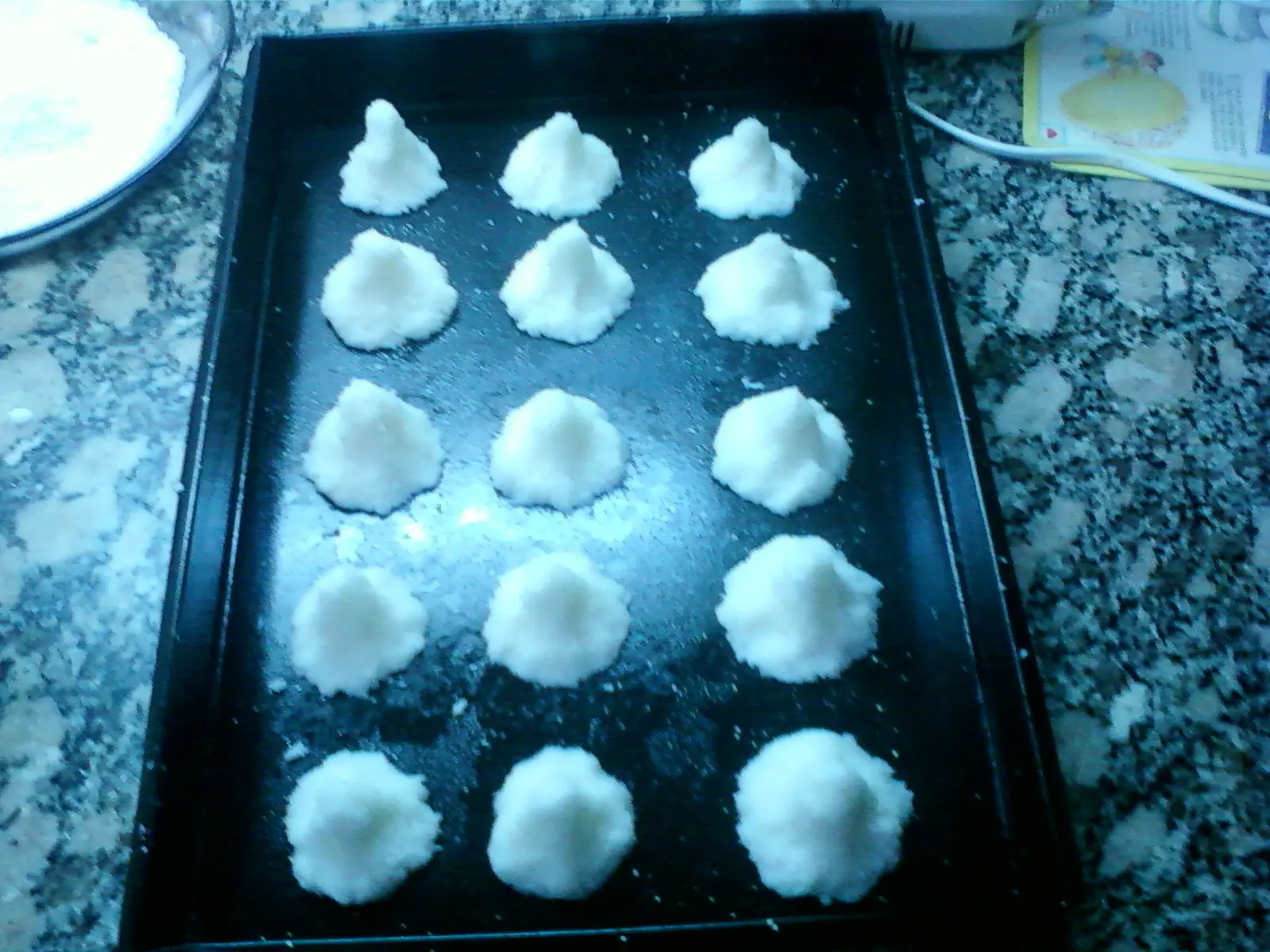 Cuando hayan tomado forma las claras agregarle de a poco el azúcar impalpable y el coco rayado, le van a poner a gusto yo le puse 10 cucharadas de cada una