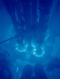 Claro que la cosa no es tan simple. En primer lugar, no se mueve sólo un electrón. Se mueven muchísimos de ellos. Y en segundo lugar, la radiación es detectable pero generalmente no es visible, pues la mayor parte de la radiación es emitida en rangos ultravioleta y superior. Pero claro, cuando el efecto es fortísimo, ahí si lo vemos: Podemos ver esa radiación azulada que detectó Cherenkov hace tanto tiempo.