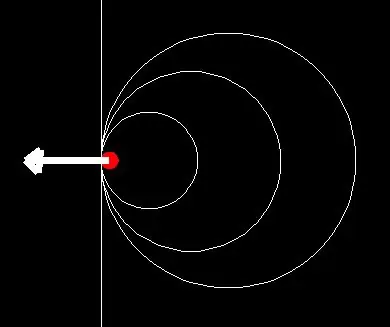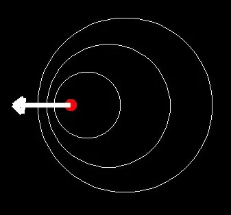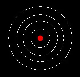 Imagina que el punto rojo es un objeto cualquiera. Supongamos además que es lo único que existe en el universo. Como sabemos, ese bojeto está formado por átomos, los cuales "vibran" en una frecuencia determinada. Los círculos concéntricos a ese objeto rojo son nada más y nada menos que las ondas de sonido que emiten esos átomos en su vibración. Hay que aclarar, también, que la onda se emite en intervalos periódicos y regulares (Por ejemplo: Cada segundo se emite una onda diferente) y también debo recordarte recordarte que esas ondas viajan a la velocidad del sonido (1224 km/h aproximadamente). Veamos qué es lo que sucede cuando el objeto se mueve: