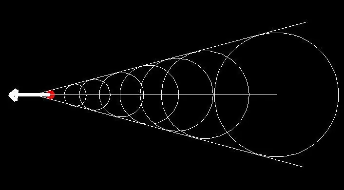 Ésto es lo que sucede cuando el objeto se mueve a una velocidad inferior a la velocidad del sonido. Los círculos dejan de ser concéntricos, es decir, las ondas no interfieren unas con otras. Si sabés algo sobre el efecto Doppler, podés mirar la imagen y caer en cuenta que ese efecto no es cualquier cosa. Veamos qué es lo que pasa cuando el objeto se mueve más rápido: