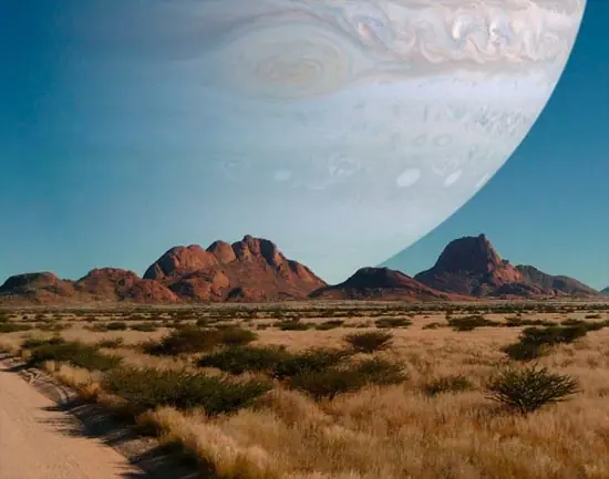 Imaginemos por un momento que el compañero de viaje de la Tierra en su travesía por el Universo no fuera la Luna sino un cuerpo celestre gigantesco como Júpiter, el planeta más grande del sistema solar. Fantaseemos y supongamos además que este coloso estuviese a los mismos 384.400 kilómetros a los que se encuentra de media nuestro satélite favorito. ¿Qué sería lo que veríamos entonces cada vez que alzáramos la vista hacia el horizonte? Algo parecido a esto:
