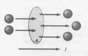 Cargas en movimiento a través de un área A. La tasa de flujo de carga en el tiempo a través del área se define como la corriente I. la dirección de a la cual la carga positiva fluiría si tuviera libertad de hacerlo.