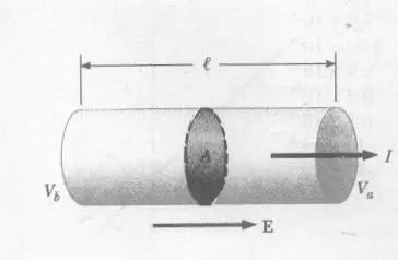 Una forma de la ley de Ohm útil en aplicaciones prácticas puede obtenerse considerando un segmento de un alambre recto de área de sección transversal A y longitud e, como se ve en la figura 27.4. Una diferencia de potencial V =Vb — Va se mantiene a través del alambre, creando un campo eléctrico en éste y una corriente. Si el campo eléctrico en el alambre se supone uniforme, la diferencia de potencial se relaciona con el campo eléctrico por medio de la relación