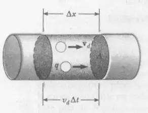 Una sección de una conductor uniforme de área de sección transversal A. los portadores de carga se mueven con una velocidad vd y la distancia que recorren en un tiempo t esta dada por x = vdt. El número de portadores de cargas móviles en la sección de longitud x está dado por nAvdt , donde n es el nmero de portadores de carga móviles por unidad de volumen.