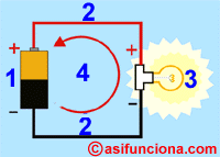 1. Fuente de fuerza electromotriz (FEM). 2. Conductor. 3. Carga o resistencia conectada al circuito. 4. Sentido de circulación de la corriente eléctrica.