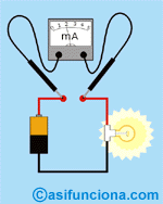 La medición de la corriente que fluye por un circuito cerrado se realiza por medio de un amperímetro o un. miliamperímetro, según sea el caso, conectado en serie en el propio circuito eléctrico. Para medir. ampere se emplea el "amperímetro" y para medir milésimas de ampere se emplea el miliamperímetro.