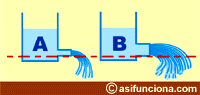 Analogía hidráulica. El tubo del depósito "A", al tener un diámetro reducido, ofrece más resistencia a< la salida del líquido que el tubo del tanque "B", que tiene mayor diámetro. Por tanto, el caudal o cantidad. de agua que sale por el tubo "B" será mayor que la que sale por el tubo "A".