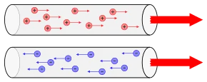 Al descubrirse los electrones como parte integrante de los átomos y principal componente de las cargas eléctricas, se descubrió también que las cargas eléctricas que proporciona una fuente de FEM (Fuerza Electromotriz), se mueven del signo negativo (–) hacia el positivo (+), de acuerdo con la ley física de que "cargas distintas se atraen y cargas iguales se rechazan". Debido al desconocimiento en aquellos momentos de la existencia de los electrones, la comunidad científica acordó que, convencionalmente, la corriente eléctrica se movía del polo positivo al negativo, de la misma forma que hubieran podido acordar lo contrario, como realmente ocurre. No obstante en la práctica, ese “error histórico” no influye para nada en lo que al estudio de la corriente eléctrica se refiere.