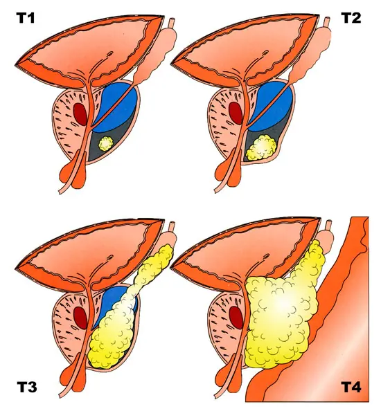 En esta imagen se ve la progresion natural de un tumor de prostata. Si invadio el recto es T4, lo que significa que es practicamente incurable