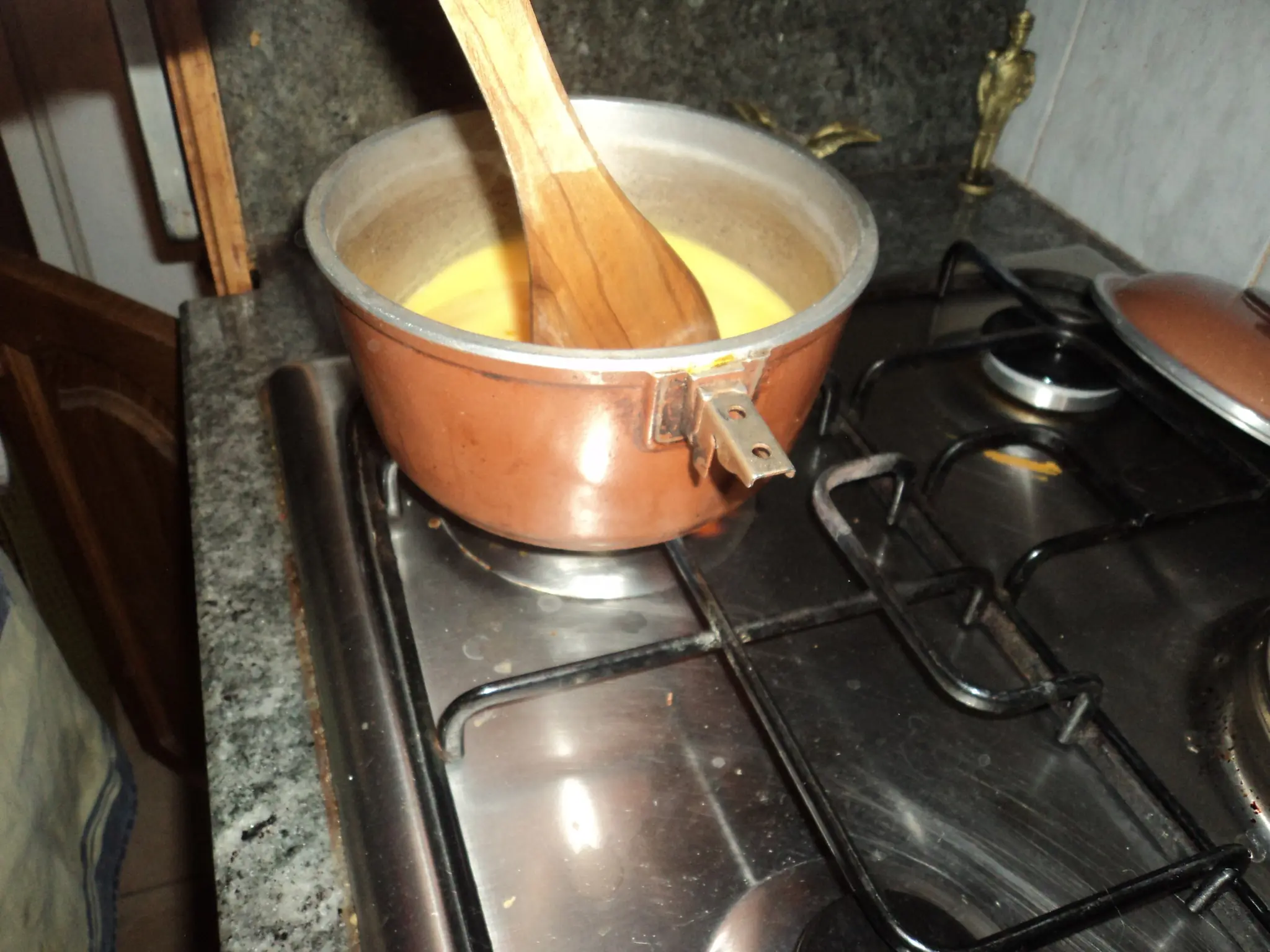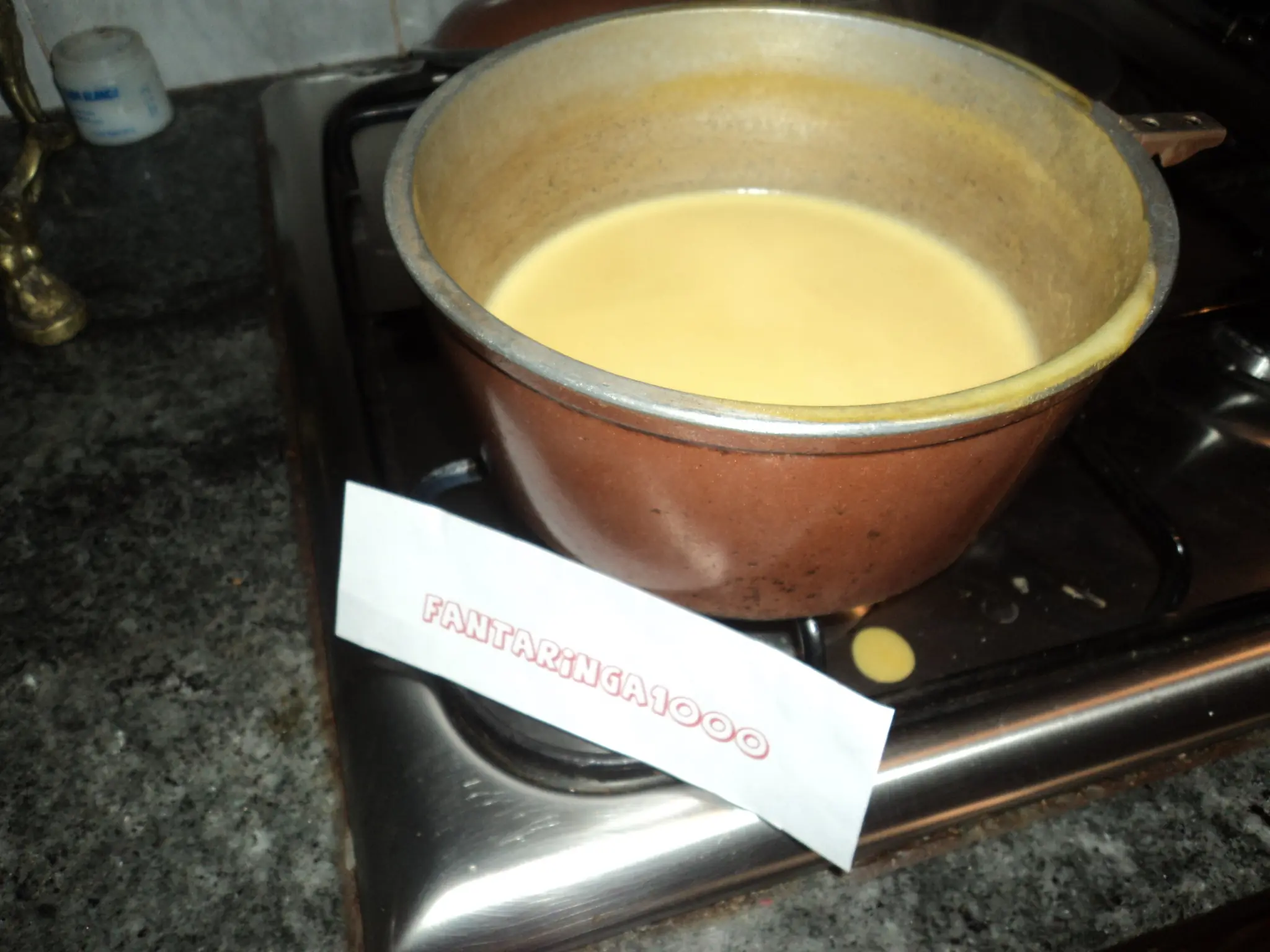 Ponemos agua adentro de una ollita y le ponemos el polvo del flan de vainilla